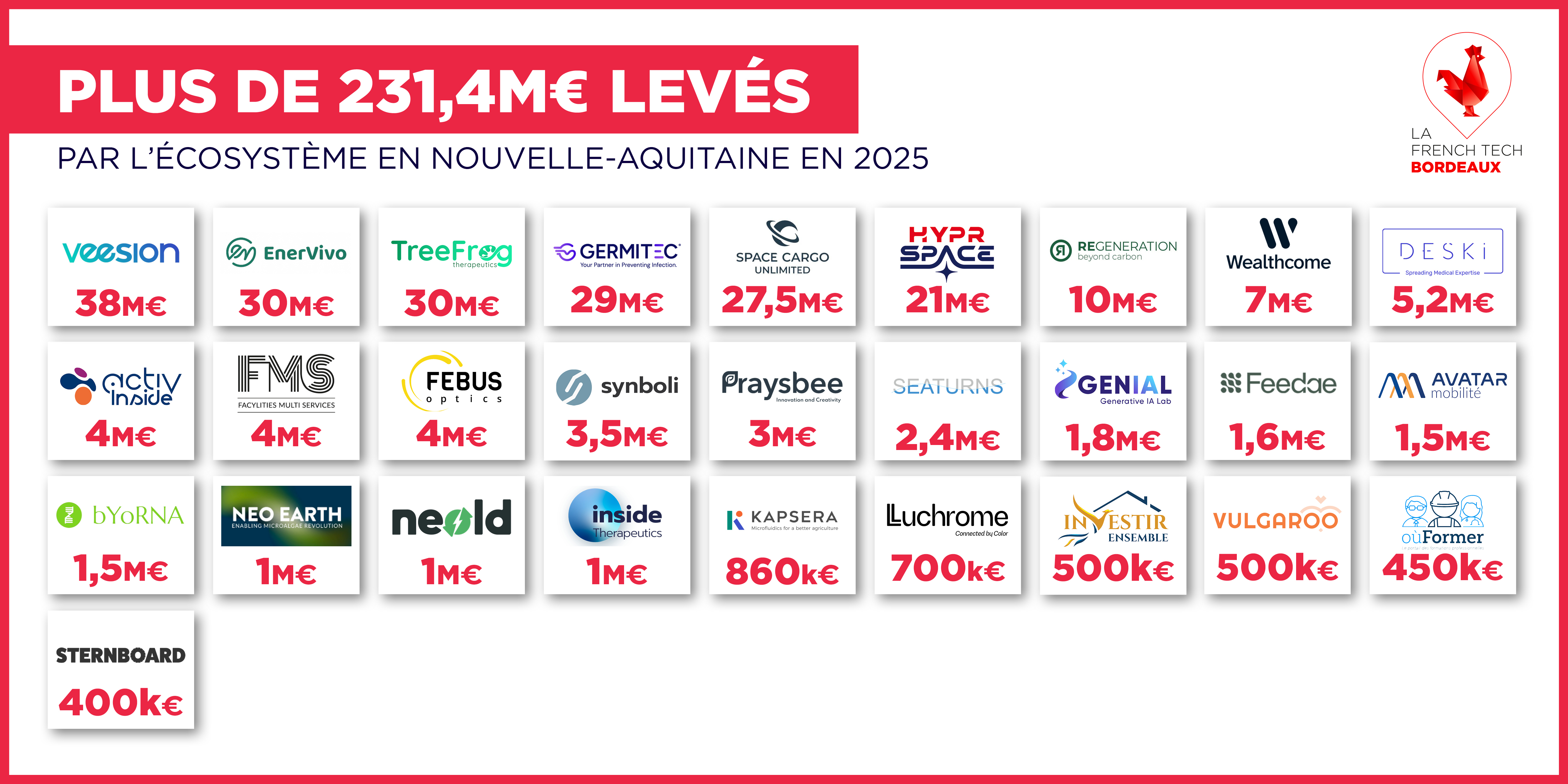 Au niveau national, plusieurs opérations d'envergure ont marqué l'exercice 2025 : Adcytherix (105 M€), Alice & Bob (100 M€), Knave (100 M€) et Waat (100 M€). En Nouvelle-Aquitaine, la plus importante levée s'établit à 38 M€ avec Veesion dont le siège social est à Bordeaux.