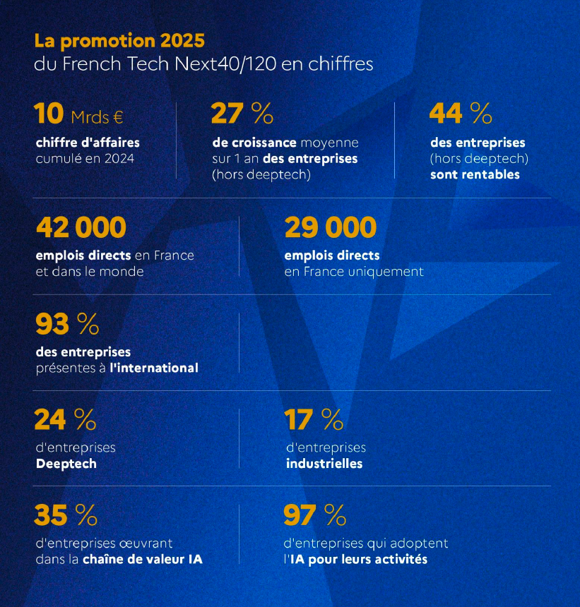 " Largement soutenus par la confiance d'investisseurs et d'importantes levées de fonds, ces premiers lauréats se sont ainsi donné les moyens de porter des ambitions élevées : accélérer leurs programmes de recherche et de développement et déployer leurs innovations auprès de clients français et internationaux. Six ans après, la majeure partie de ces premiers lauréats ont réussi leur pari : celui de transformer une innovation en réussite commerciale, en créant des dizaines de milliers d'emplois et en générant des centaines de millions de revenus. Parmi les 40 lauréats de la première promotion du French Tech Next40, 11 figurent dans cette 6e sélection. Alors qu'en 2019, ils avaient été sélectionnés sur critère de levées de fonds, ils le sont en 2025 sur la base de leurs revenus. Ils ont créé des marques renommées et des produits et services largement adoptés par le grand public : par exemple Back Market pour le high-tech reconditionné, Blablacar pour le covoiturage ou encore Doctolib pour les rendez-vous médicaux. Ce sont également des innovations qui séduisent les grandes entreprises et administrations publiques : Alan est l'assureur-santé des agents du Ministère de la Transition écologique, la solution Payfit a été adoptée par plus de 18 000 TPE et PME pour la gestion de leur paie, Contentsquare équipe plus de 2 000 entreprises dont des grands groupes français et internationaux tels que Engie, AXA, Samsung, Visa… ", indique la Mission French Tech.